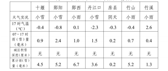 日前(17时),北部阴天有小雪,南部阴天有小雨。大部气温0℃ 左右,最低武当山金顶-7℃。
