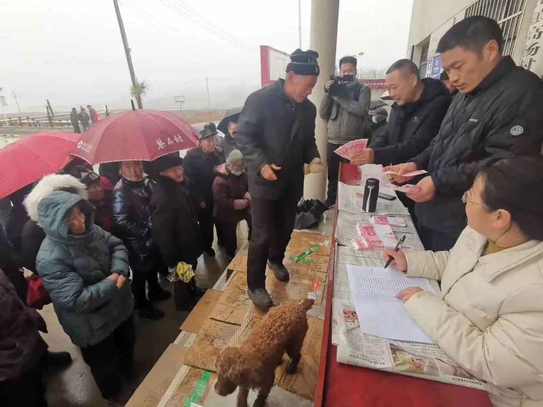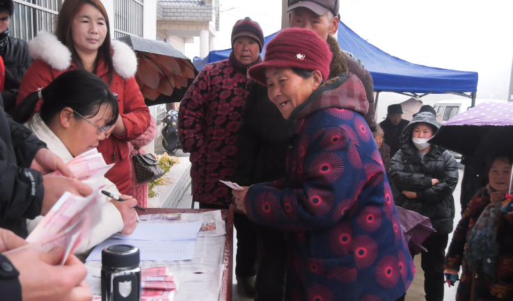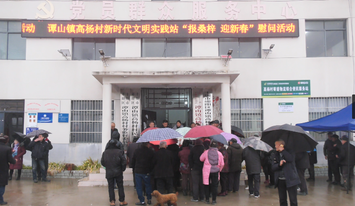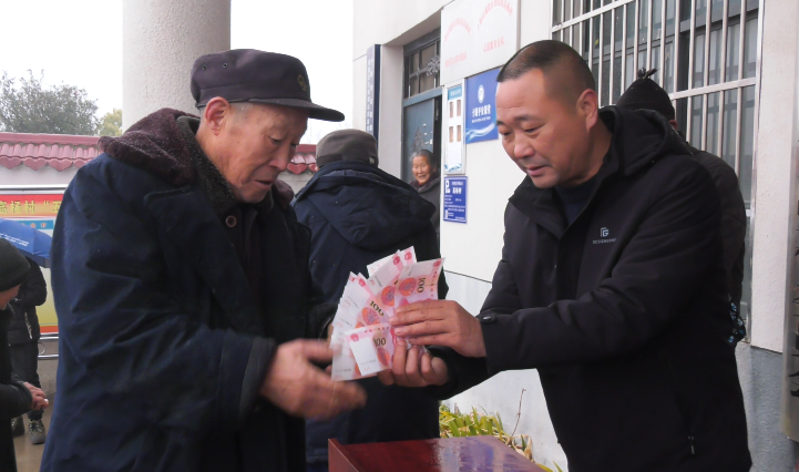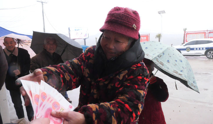 郧阳区谭山镇高杨村部小广场,寒风凛冽、冷雨潇潇,却挡不住该村在外成功人士章玉华为村上老人发放敬老金的热情。
