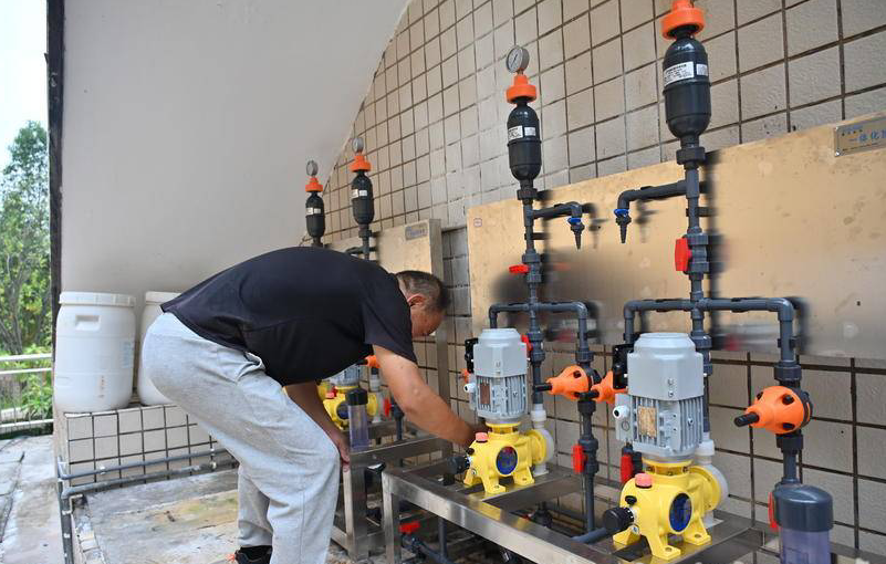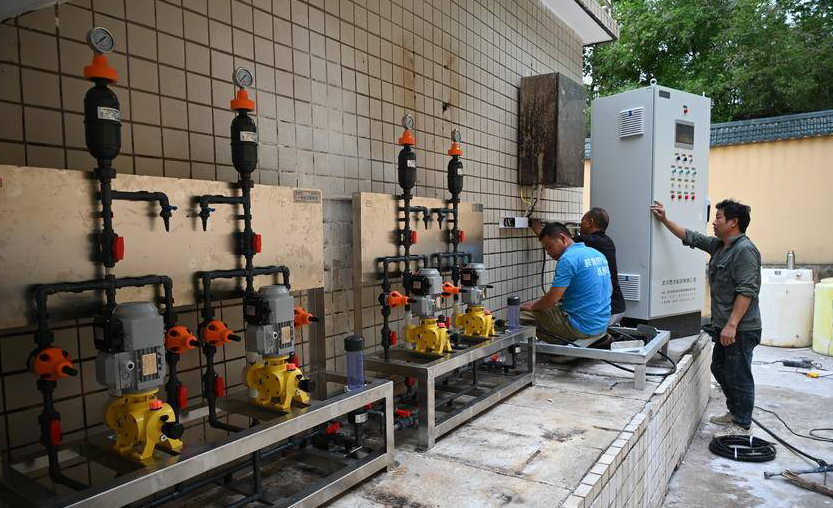 9月2日,技术人员正在为实施农村供水标准化改造的十堰市郧阳区大柳乡凤儿河水厂和城关镇洞儿河水厂安装次氯酸钠发生器。