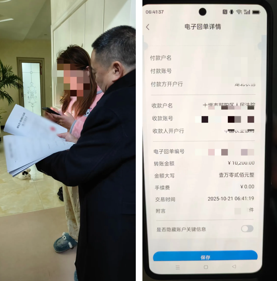 执行干警上门时,被执行人聂某恰巧不在家,其妻子对拖欠挖机费用一事并不知情。执行干警随即出示生效判决书及执行通知书等材料,详细告知案件情况以及聂某应履行的法律义务,并阐明拒不履行将面临纳入失信被执行人名单、移送追究拒执罪等严重后果。聂某妻子通过电话与聂某沟通后,当场以微信转账方式履行了10200元,该案顺利执结。