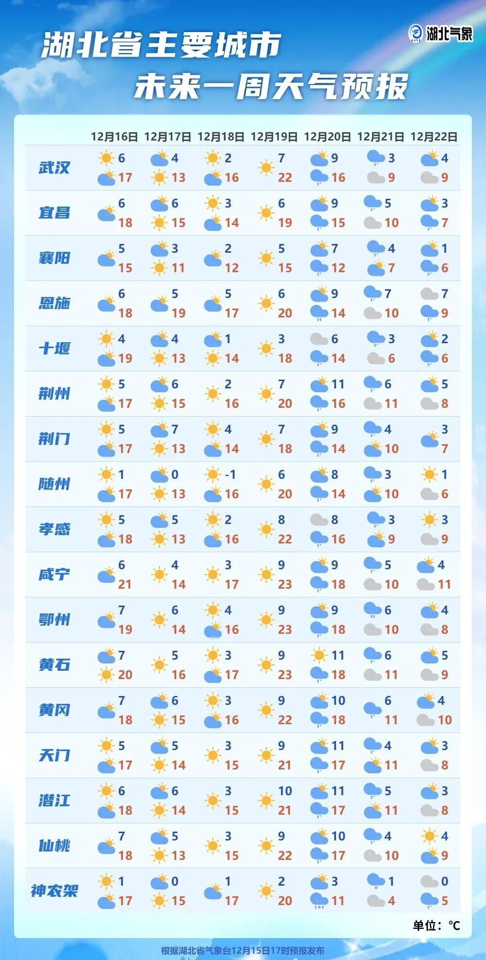 12月15日20时-16日08时,全省多云到晴天。最低气温北部0~3℃、南部3~7℃,偏南风2到3级。
