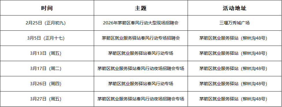 依托“湖北公共招聘网”(www.hbggzp.cn)开展“网上春风行动”,2026年2月1日一3 月31日每周发布2-4场“网上春风行动”网络招聘会,活动期间累计举办网络招聘不少于20场,累计参会企业不少于120家,发布就业岗位5000个以上。