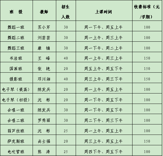 5.书法班、国画班、电子琴班、萨克斯班、非洲鼓班、老年瑜伽班由学校提供学习器材,其它专业学习教材、相关用品根据老师安排自备。