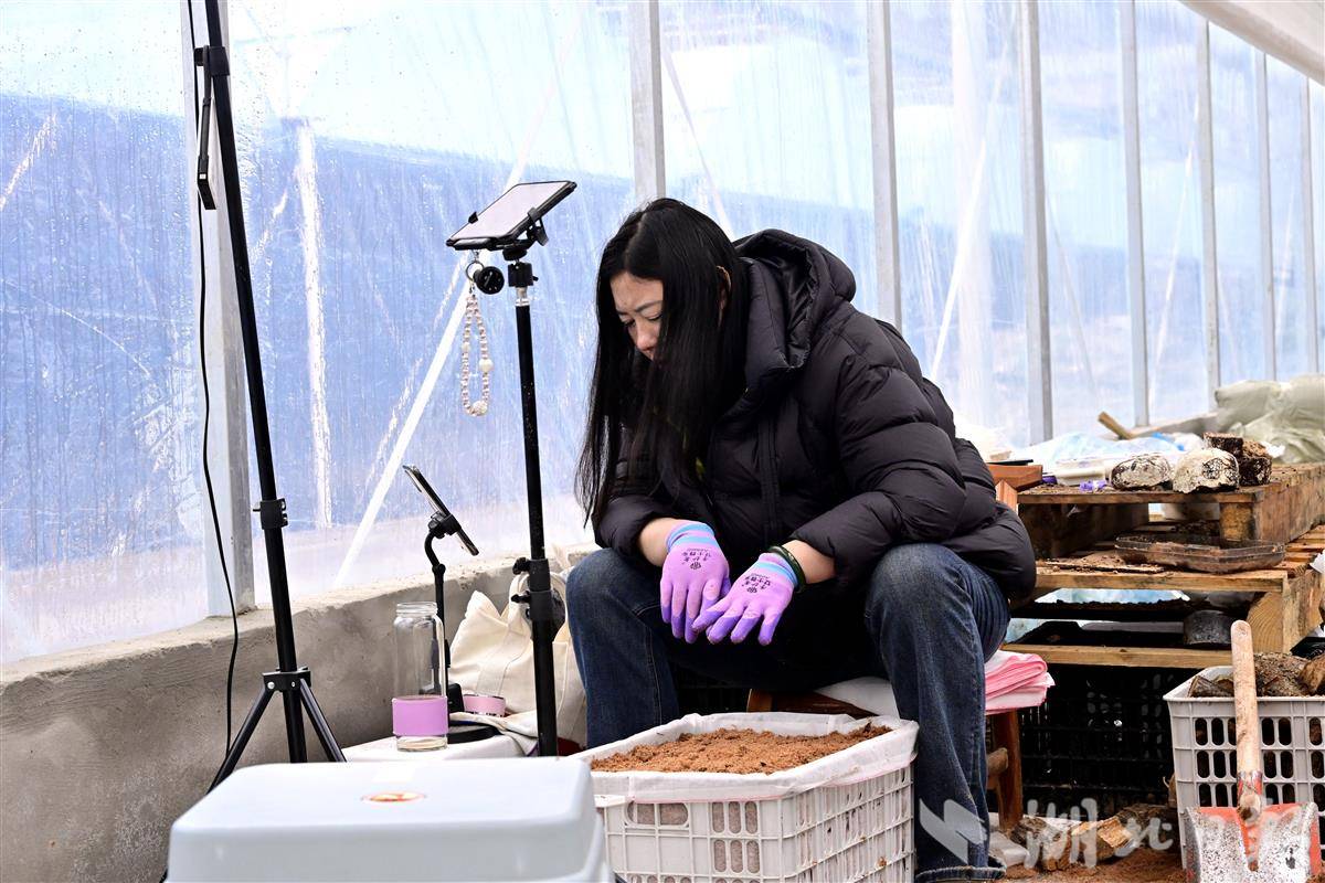 3月18日,在十堰市郧阳区谭家湾镇黄畈村郧阳筐栽天麻种植示范基地,基地主播正在线上直播销售筐栽天麻。