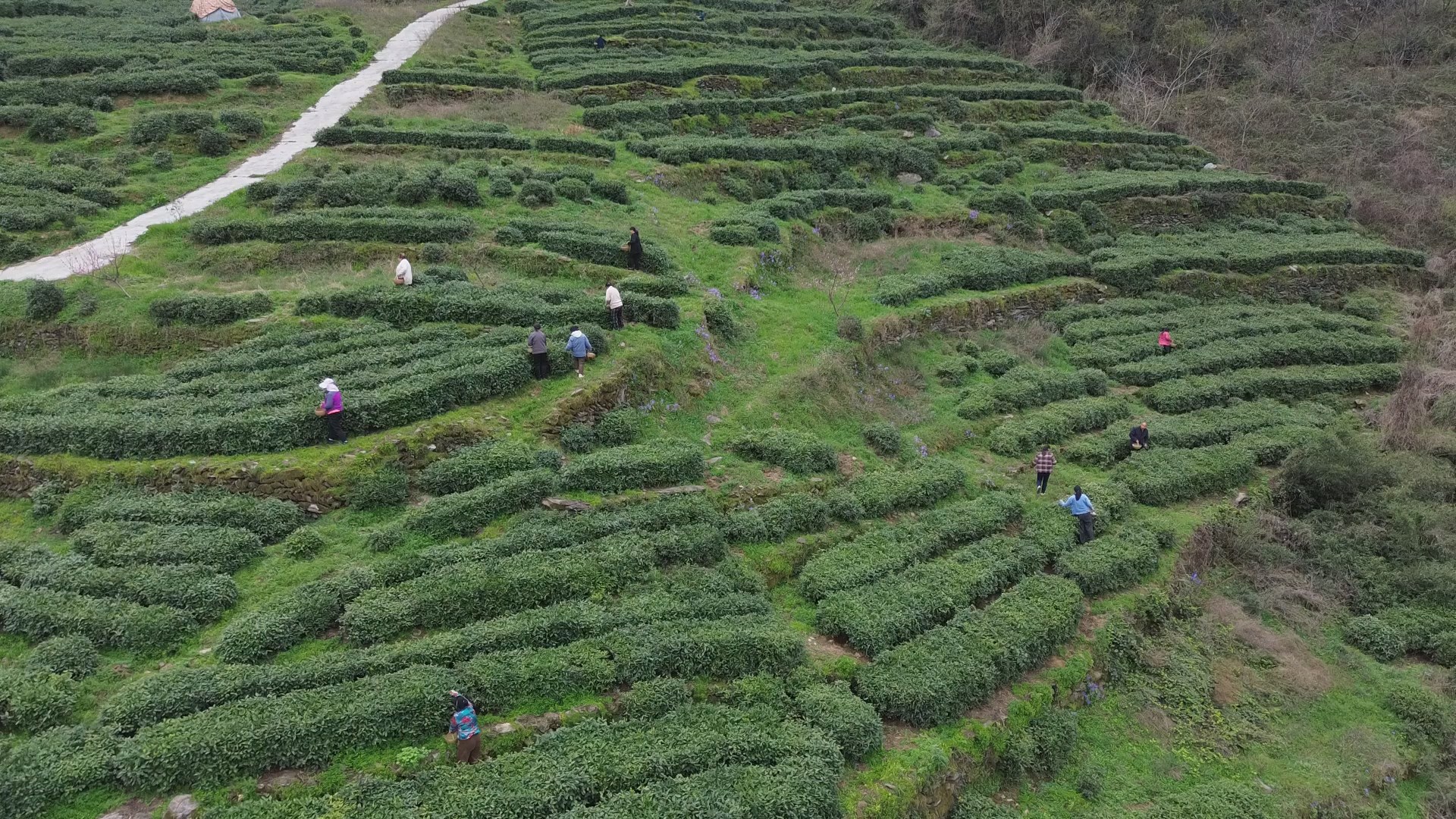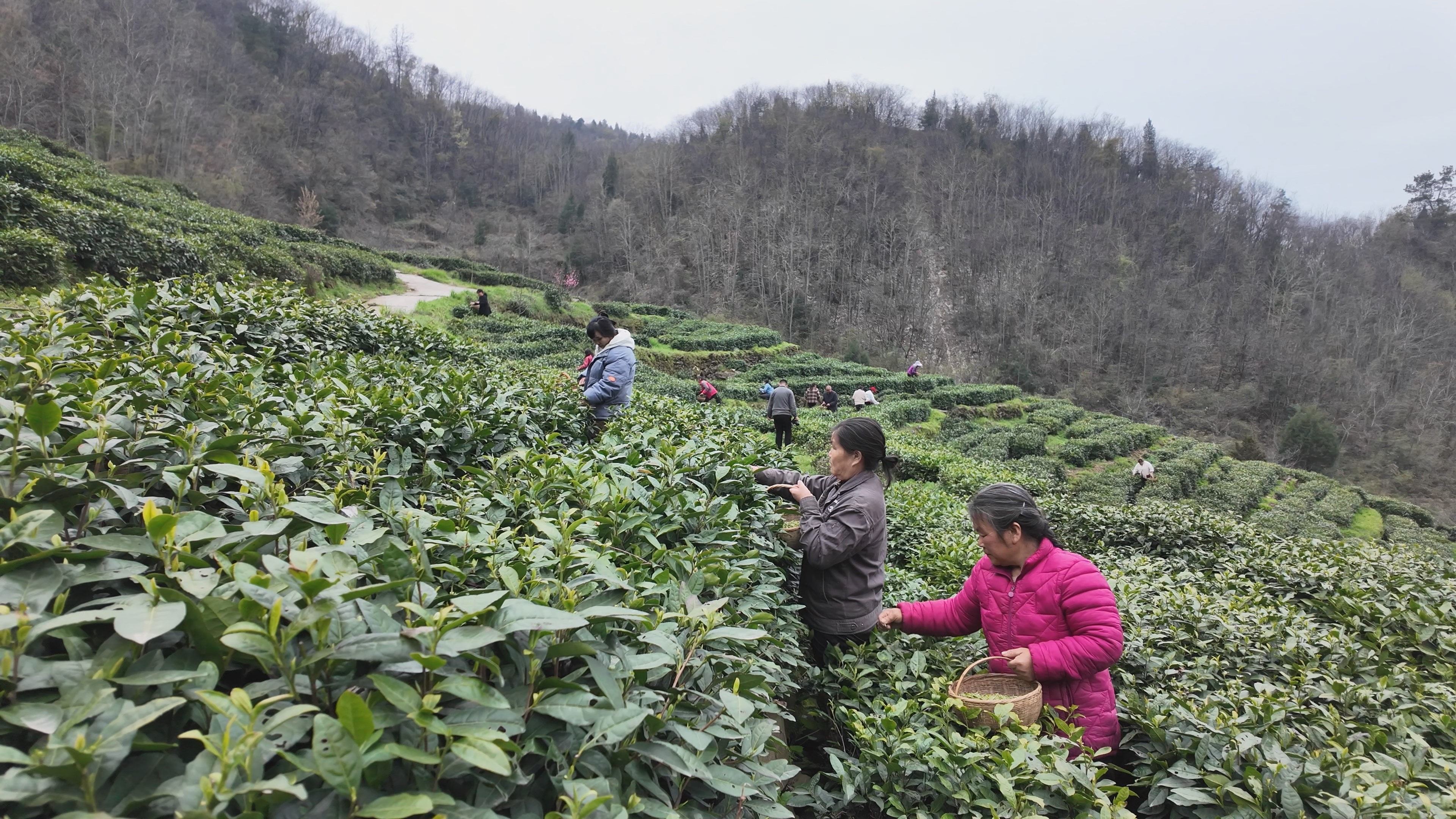 走进谭家湾镇山间茶园,鲜嫩的茶芽缀满枝头,清香萦绕山间。村民身挎竹篓,熟练地将鲜嫩的茶芽轻轻采下。茶农李秀莲介绍,一天可以挣200元,补贴家用,小孩也照顾了,很开心。