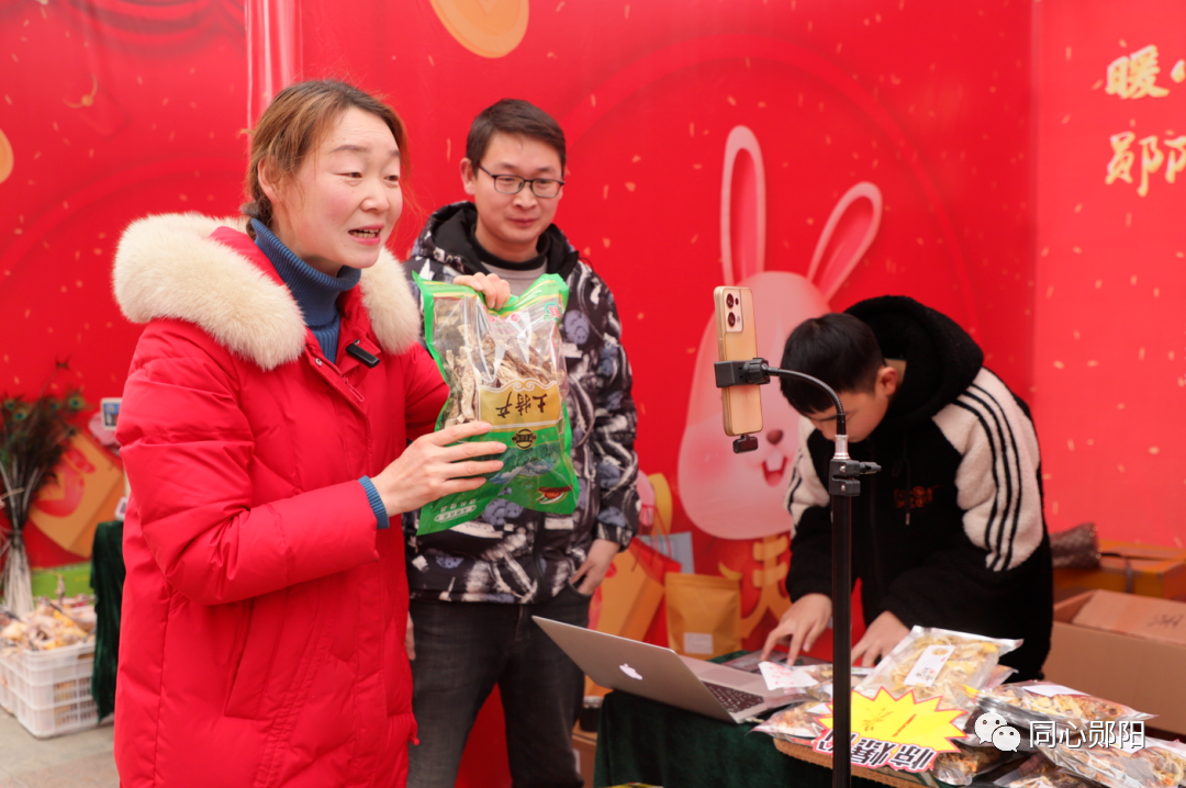 1月13日,“暖心辞旧岁·玉兔迎新春”郧阳区2023年乡村振兴年货节在郧阳区新天地金座商业街成功举办。本土网络达人将直播间搬到了年货现场,一边直播,一边销售,营造“线上、线下”联动的火热消费氛围。
