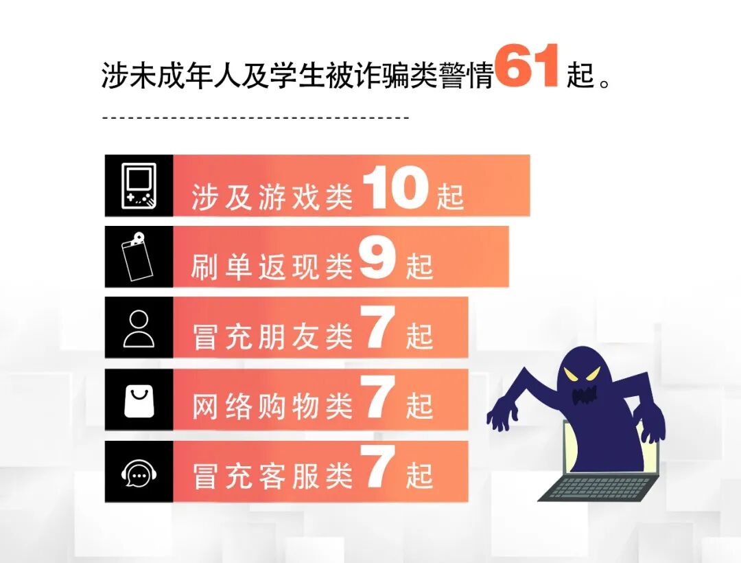 7月,全省共接涉未成年人及学生被诈骗类警情61起,主要涉及游戏、刷单返现、冒充朋友、网络购物、冒充客服等情况。青少年好奇心强,社会经历浅薄,法治意识欠缺,是受骗高危群体。尤其是初、高中生,虽然可支配的财物不多,但被骗“上套”后,往往绑定家长银行卡付款,被骗金额不少。大学生是骗子们眼中的“优质客户”“大客户”,他们大多是手机和网络的重度使用者,触网更多,情感更丰富,很多大学生还有通过网络兼职来赚钱的刚需,能被利用的漏洞更多。