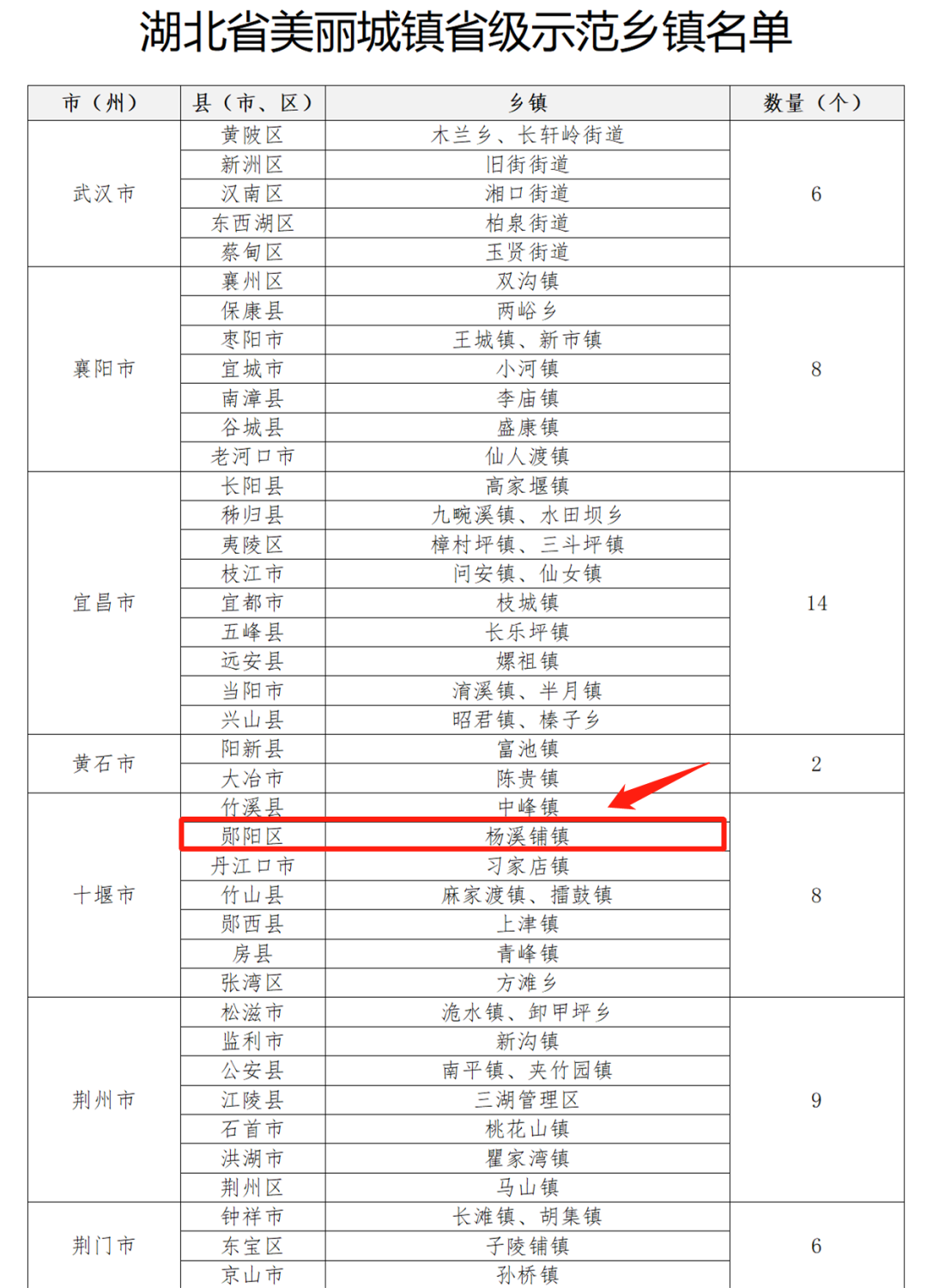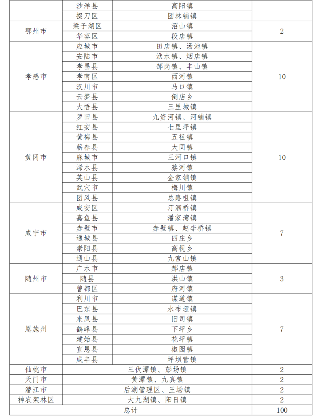 《通知》称,根据《湖北省“擦亮小城镇”建设美丽城镇三年行动实施方案(2020-2022年)》(鄂政办发〔2020〕54号),在全省开展了“美丽城镇省级示范乡镇”创建示范活动,经各地推荐、省级复核、社会公示、研究讨论,确定了武汉市黄陂区木兰乡等100个乡镇为全省美丽城镇省级示范乡镇。