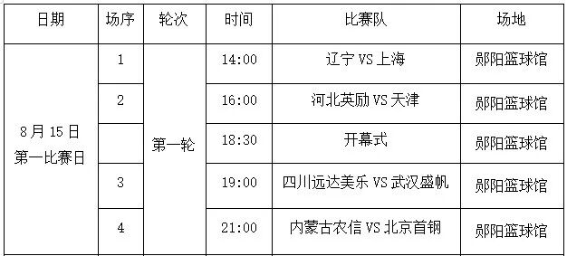 决赛开幕式,将于8月15日18:30分,在郧阳篮球馆举行。决赛首日,共有8支比赛队伍,带来4场精彩赛事。