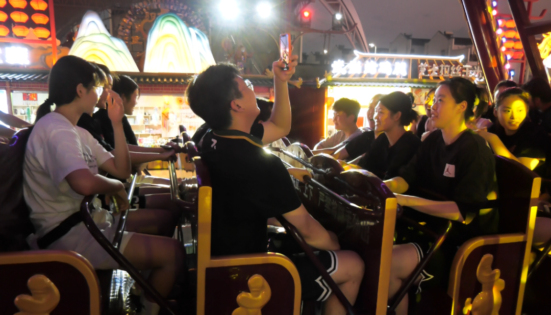 球员们还挑战了海盗船,感受刺激摇摆和欢声笑语;尝试套圈小游戏,展示灵活的手眼协调能力。