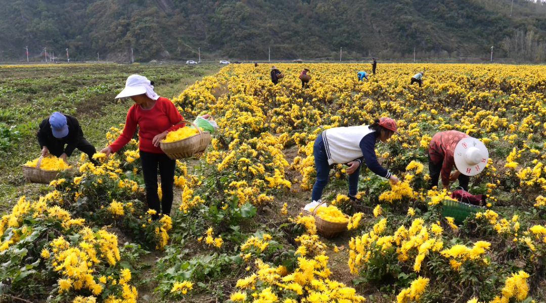 眼下,五峰乡2000余亩菊花进入盛花期,当地村民趁着好天气加紧采摘成熟的花朵,田间地头呈现一派繁忙的丰收景象。