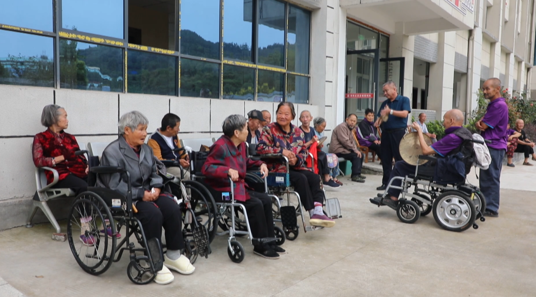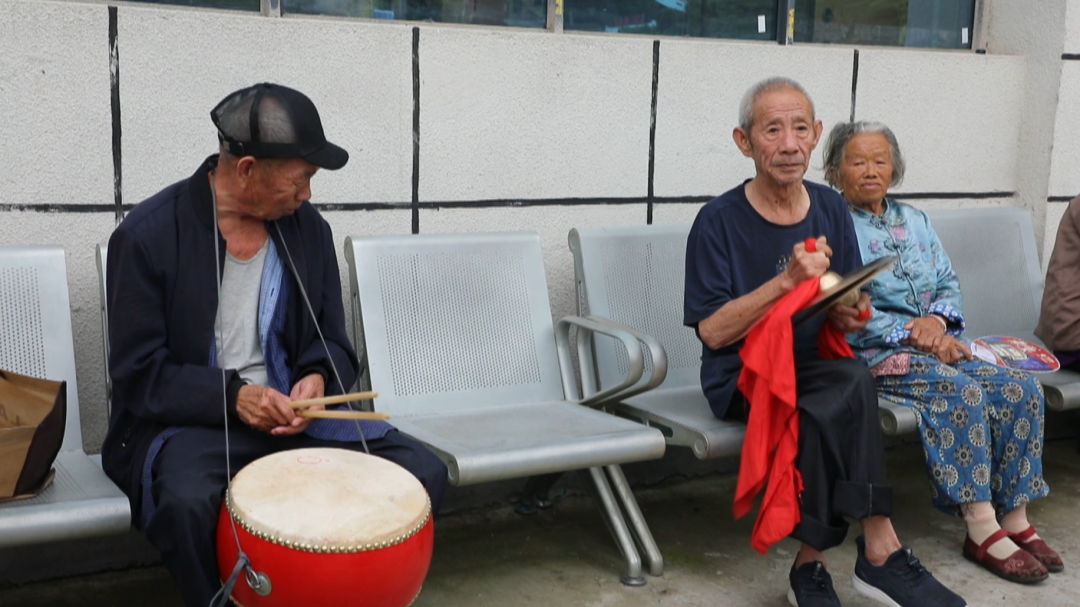 一大早,在茶店镇福利院内,老人兰田均正和其他院民一起敲锣打鼓,心情格外舒畅。