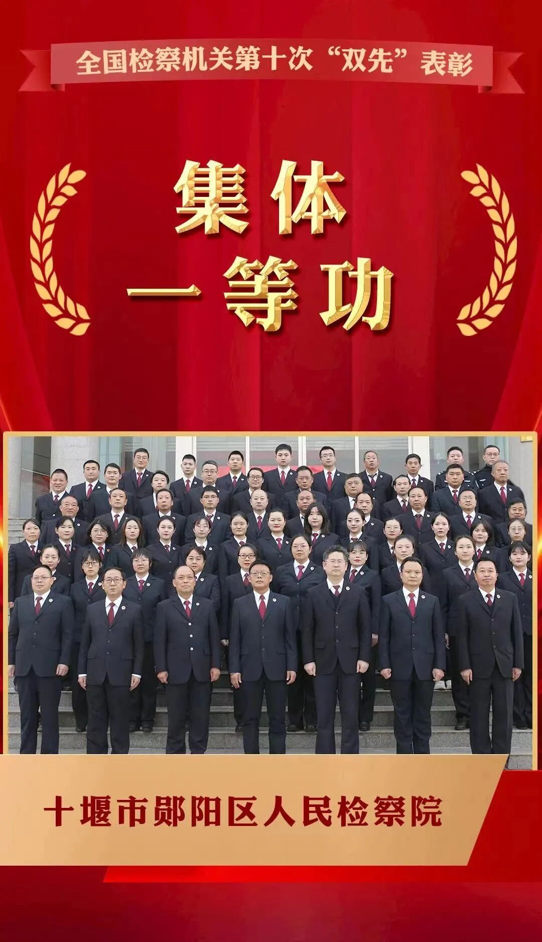 集体一等功!郧阳区人民检察院 2023-12-21 08:22 区融媒体中心 0 12月20日,最高人民检察院召开全国检察机关队伍建设工作会议暨第十次先进集体、先进个人表彰大会,郧阳区人民检察院荣获“集体一等功”。