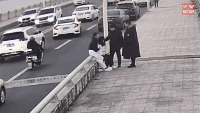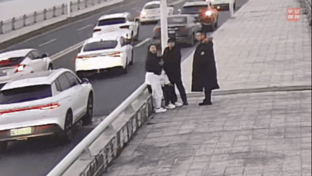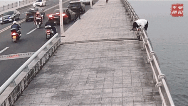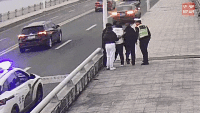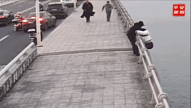 “桥边危险,请勿翻越护栏!”“桥边危险,请勿翻越护栏!”民警不停地喊话吸引女子注意刹那间一名黑衣群众冲到了她面前拦腰将其抱住