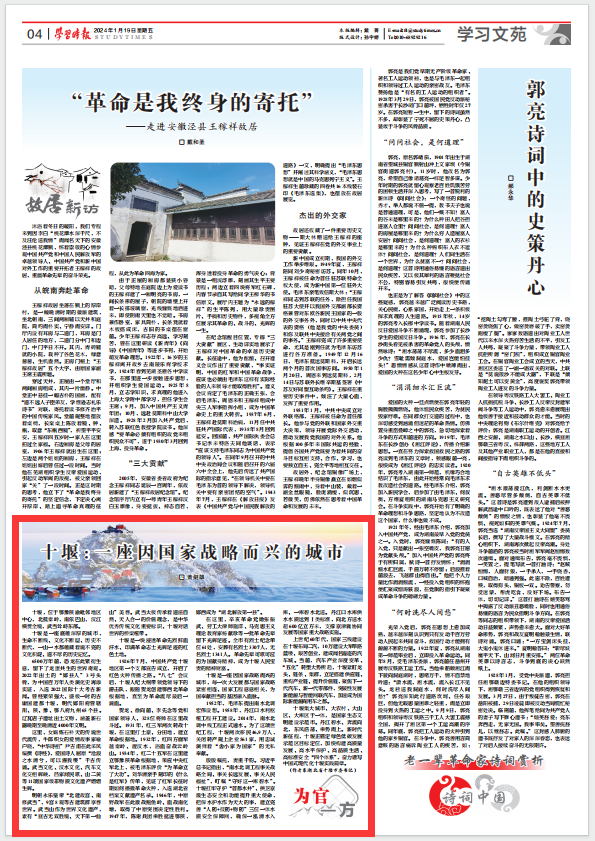 十堰,位于鄂豫陕渝毗邻地区中心,北抵秦岭,南依巴山,汉江横贯全境,武当耸峙东部。十堰是一座底蕴深厚的城市,生命不断线、文化不断层、历史不断代,一山一水都蕴藏着说不完的文化积淀、道不尽的历史记忆。6500万年前,恐龙在此繁衍生息,留下了龙蛋共生的世界奇观。2022年出土的“郧县人”3号头骨,为中国百万年人类演化史再添实证,入选2022国际十大考古新闻。曾经繁荣强大、盛极一时的古庸国建都十堰,明代郧阳府管辖川、陕、豫、鄂八府九州65个县。辽瓦店子遗址出土文物,涵盖新石器晚期至晚清近4000年文明。这里,女娲炼石补天的传说世代流传,牛郎织女的爱情故事家喻户晓,“中华诗祖”尹吉甫在此采风编撰《诗经》,爱国诗人屈原“沧浪之水清兮,可以濯我缨”千古传诵。武当文化、汉水文化、汽车文化交相辉映,吕家河民歌、山二黄等11项国家级非物质文化遗产熠熠生辉。明朝永乐皇帝“北建故宫、南修武当”,9宫8观等古建筑群享誉世界。武当山作为世界文化遗产,素有“亘古无双胜境、天下第一仙山”美誉。武当太极传承着道法自然、天人合一的价值理念,是中华优秀传统文化重要标识、十堰对话世界的桥梁纽带。十堰是一块浸透革命先烈鲜血汗水、印满革命志士光辉足迹的红色土地。1926年7月,中国共产党十堰地区第一个支部宣告成立,开启了红色火种传播之路。“八七”会议后,十堰人纪大纲带领党领导下的游击队,跟随贺龙创建鄂西北革命根据地,直至为革命流尽最后一滴血。贺龙、徐向前、李先念等党和国家领导人、328位将帅在这里战斗过。1931年,红三军两次转战十堰,在这里打土豪、分田地,建立革命根据地。1932年,红四方面军越秦岭、渡汉水,浴血奋战云岭山。1934年,红二十五军在这里建立鄂豫陕革命根据地,策应中央红军北上,被毛泽东评价“为革命立了大功”。刘华清亲手刻印的《什么是红军》传单,见证了红军长征时期如何播撒革命火种,入选湖北省档案文献遗产名录。1946年,中原野战军在此激战鲍鱼岭、血战南化塘,取得了中原突围决定性胜利。1947年,陈谢兵团乘胜挺进鄂陕,郧西成为“湖北解放第一县”。在这里,辛亥革命元勋张振武、劳工大律师施洋、马克思主义理论教育家杨献珍等一批革命先辈留下光辉足迹。全市有烈士纪念单位61处,安葬有名烈士3307人,无名烈士1341人。革命先辈可歌可泣的为国献身精神,成为十堰人民宝贵的精神财富。十堰是一座因国家战略而兴的城市,每一次大发展都与国家战略紧密相连、国家工程息息相关,为国奉献担当的基因融入血脉。1952年,毛泽东提出南水北调宏伟设想。1958年,丹江口水利枢纽工程开工建设。2014年,南水北调中线工程正式通水。为了这项世纪工程,十堰两次移民46.9万人,关闭转产规上企业561家,用忠诚演绎着“舍小家为国家”的无私奉献。殷殷嘱托,责重千钧。习近平总书记指出,“南水北调工程事关战略全局、事关长远发展、事关人民福祉”,叮嘱“守好这一库碧水”。十堰扛牢守护“首都水井”、拱卫京畿生态安全和功能提升重大使命,把保水护水作为天大的事,建立完善“人防+技防+物防”三位一体水质安全保障网,确保一泓清水入库、一库碧水北送。丹江口水库供水水质达到Ⅰ类标准,向北方送水超600亿立方米,支撑京津冀协同发展等国家重大战略实施。上世纪60年代,国家三线建设在十堰布局二汽,10万建设大军筚路蓝缕、艰苦创业,建成闻名遐迩的汽车城。当前,汽车产业深度变革、“五化”转型大势所趋,十堰紧盯龙头、链条、集群,立足搭建供应链、重构产业链、提升价值链,聚焦下一代汽车、新一代零部件,突破性发展新能源与智能网联汽车,加速成为国际新能源商用车之都。十堰集大城市、大农村、大山区、大库区于一体,是国家生态文明建设示范市。丹江碧水、奔流向北,东风浩荡、乘势而上。新时代新征程,十堰正锚定绿色低碳发展示范区目标定位,加快构建高质量发展、高水平保护、高品质生活、高标准安全“四个体系”,奋力谱写中国式现代化十堰实践篇章。