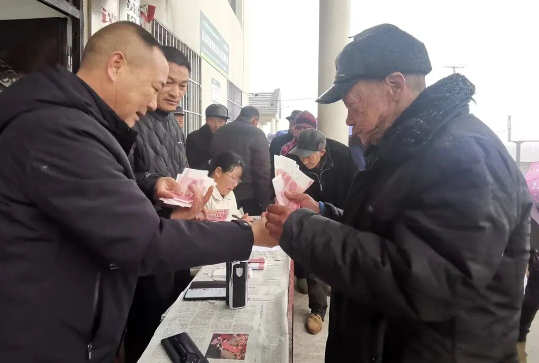 刚领到钱的高儒贵笑呵呵地说:“我这是第6次领钱,往年都是500块,章老四(章玉华)说今年是龙年,发600块,真要谢谢玉华。”