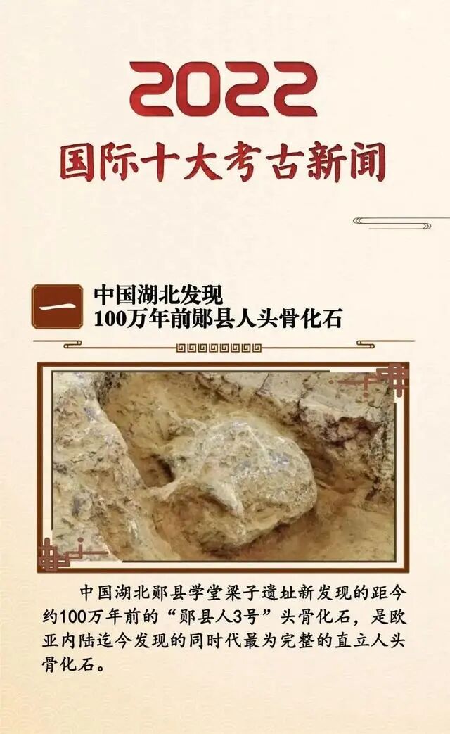 2022年,“郧县人”3号头骨在郧阳区学堂梁子遗址被提取出土,这是迄今欧亚内陆发现的同时代保存最为完好的古人类头骨化石,实证了我国百万年的人类演化史。同年12月,“郧县人头骨化石”入选2022国际十大考古新闻。