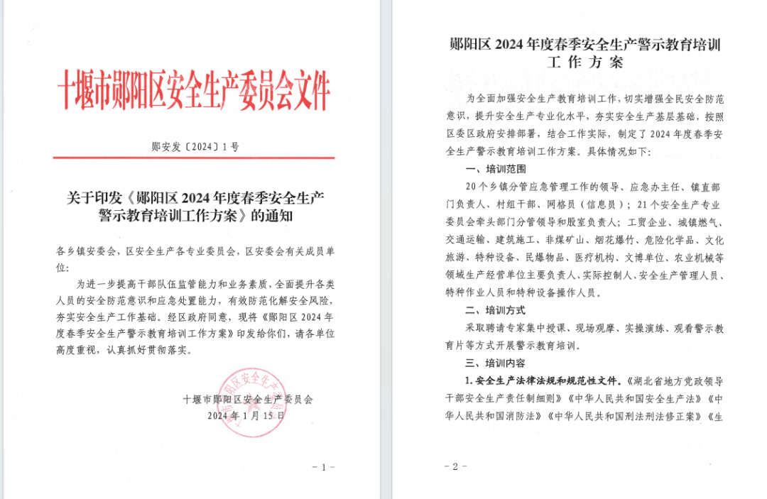 2024年1月15日,区安委会印发《郧阳区2024年度春季安全生产警示教育培训工作方案》,全面部署2024年春季安全生产警示教育培训工作。要求20个乡镇和21个专委员会在3月31日前,通过采取聘请专家集中授课、现场观摩、实操演练、观看警示教育片等方式,分级分类分批完成对乡镇、村(社区)、区直部门分管安全生产的领导、从事安全生产工作人员,以及重点领域生产经营单位主要负责人、实际控制人、安全生产管理人员、特种作业人员和特种设备操作人员的系统培训。区应急管理局负责组织对20个乡镇应急办主任和应急办工作人员的教育培训,通过专家授课、地震疏散演练、经验交流等方式,切实提高乡镇应急管理干部业务水平和工作能力。