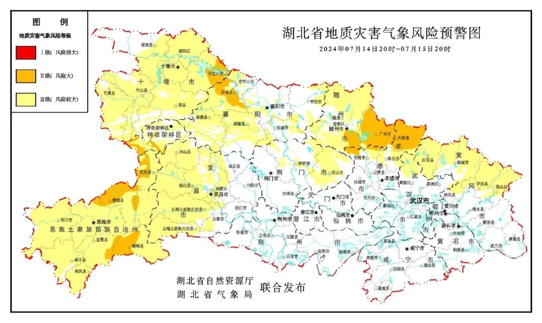 7月14日20时—7月15日20时,预计三峡库区,神农架林区、十堰地区、襄阳地区、恩施地区、荆门地区、随州地区,宜昌(宜昌市城区、远安、长阳、五峰、宜都)、孝感(安陆、大悟、孝昌)、武汉(黄陂、新洲)、黄冈(红安、麻城、团风、罗田、英山)以及其他强降水区域发生崩塌、滑坡、泥石流的风险较大;其中,三峡库区(巴东局部),神农架林区西部、十堰(丹江口东部)、襄阳(谷城北部和东部)、恩施(恩施市北部、建始北部、宣恩东部、鹤峰西部)、随州(曾都区、广水)、孝感(安陆、大悟)发生崩塌、滑坡、泥石流的风险大。