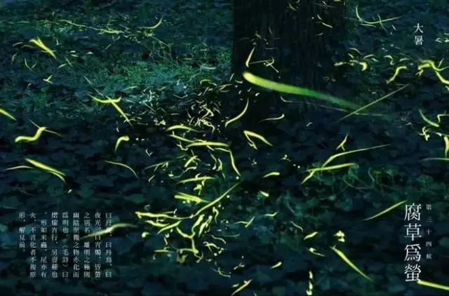 盛夏时节的萤火虫,因产卵于枯草上,孵化以后从枯草中飞出,被古人误会为是腐草变成的,即为“一候腐草为萤”。