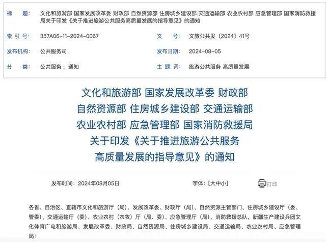8月5日,据文旅部网站消息,文化和旅游部、国家发展改革委、财政部等九部门印发《关于推进旅游公共服务高质量发展的指导意见》(以下简称《意见》)。