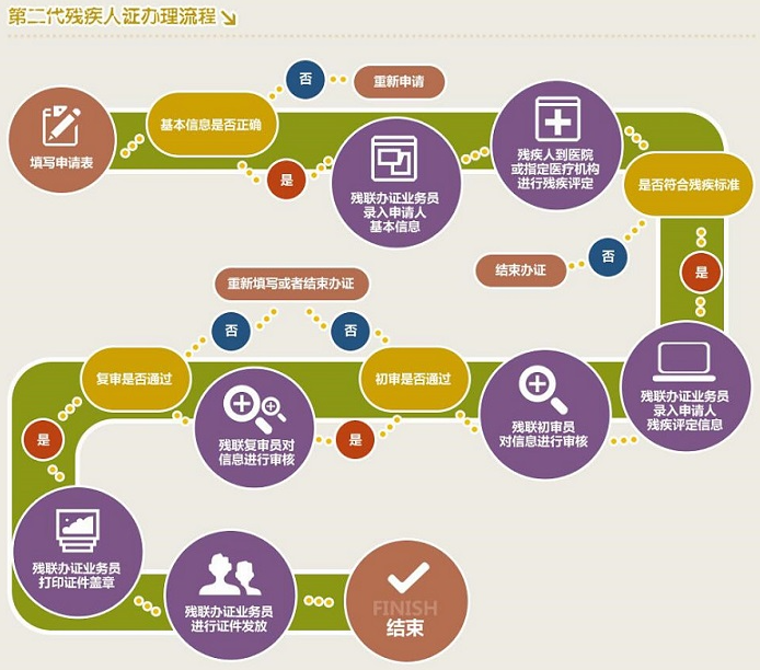 7.领取、保存:申请人到县级残联领取经审核批准的残疾人证,本人保存一份申请表、评定表等相关档案资料。