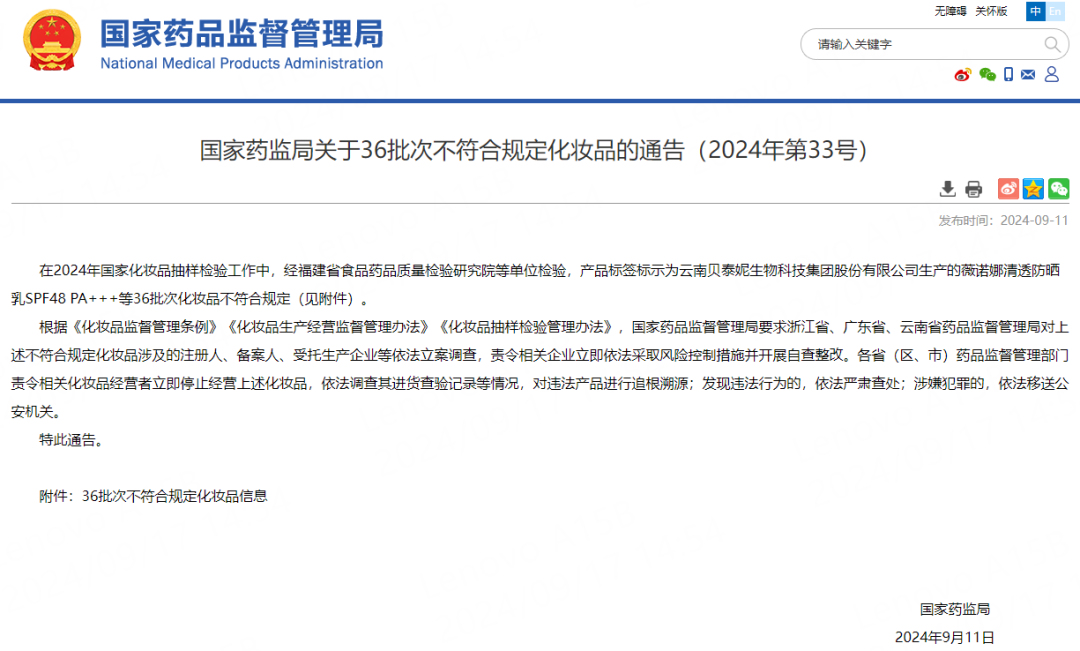 在2024年国家化妆品抽样检验工作中,经福建省食品药品质量检验研究院等单位检验,产品标签标示为云南贝泰妮生物科技集团股份有限公司生产的薇诺娜清透防晒乳SPF48 PA+++等36批次化妆品不符合规定。根据《化妆品监督管理条例》《化妆品生产经营监督管理办法》《化妆品抽样检验管理办法》,国家药品监督管理局要求浙江省、广东省、云南省药品监督管理局对上述不符合规定化妆品涉及的注册人、备案人、受托生产企业等依法立案调查,责令相关企业立即依法采取风险控制措施并开展自查整改。各省(区、市)药品监督管理部门责令相关化妆品经营者立即停止经营上述化妆品,依法调查其进货查验记录等情况,对违法产品进行追根溯源;发现违法行为的,依法严肃查处;涉嫌犯罪的,依法移送公安机关。点击下方大图查看