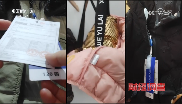 这些标识又是怎么来的呢?直播间工作人员介绍:“这个标随便做的,做标的人就在屋里,我让他做啥标就做啥标。”甚至检验检测报告、羽绒充气标,也是电商们成批采购来的,一套成本仅1元、2元,“牌牌1元钱、2块钱”。