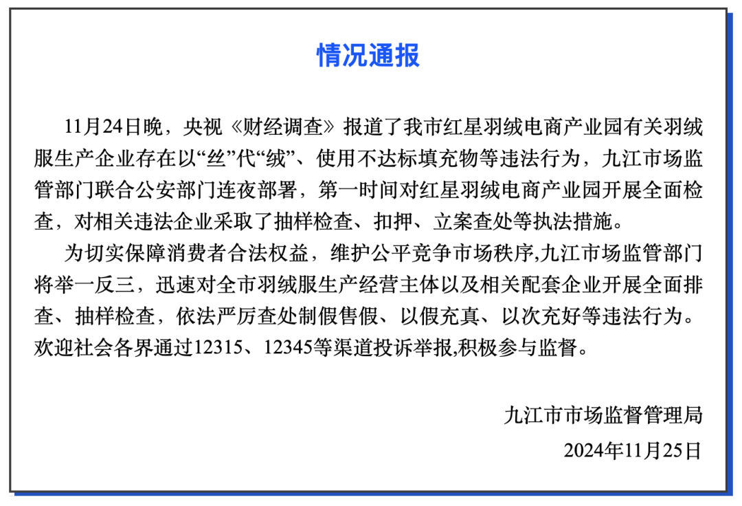江西九江市场监督管理局发布情况通报称,对相关违法企业采取了抽样检查、扣押、立案查处等执法措施。