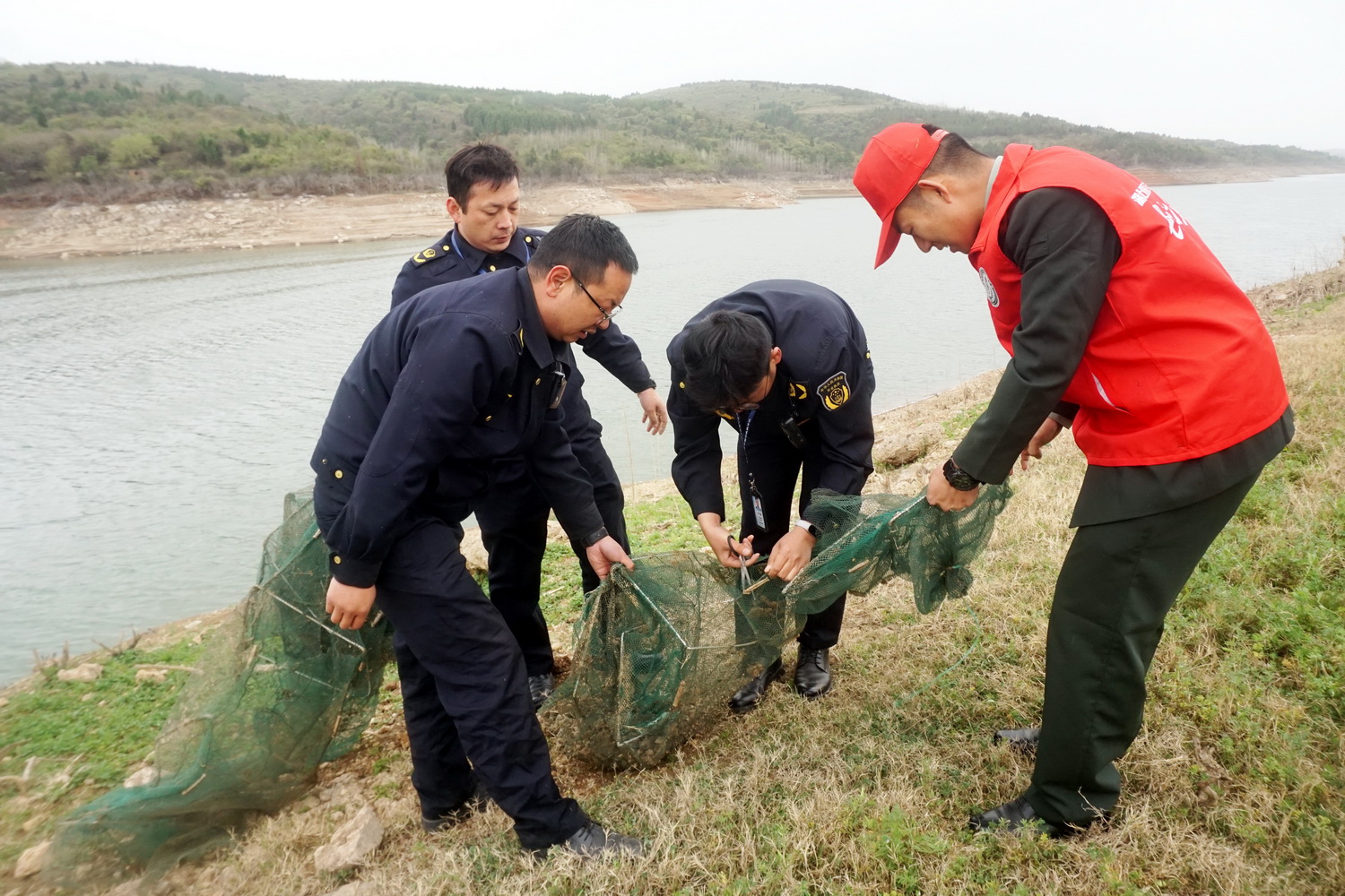 3月28日,南水北调中线水源区,郧阳区农业农村局综合执法大队五中队的执法队员在汉江安阳镇段收缴水下地笼子并予以销毁。为保护一泓清水永续北送,该局综合执法大队每天对136公里辖区汉江沿岸进行巡逻检查,2024年度共收缴非法钓鱼鱼竿300多杆。