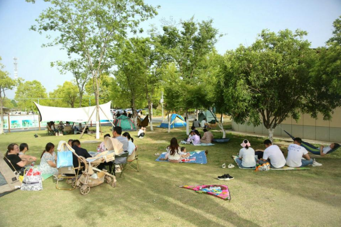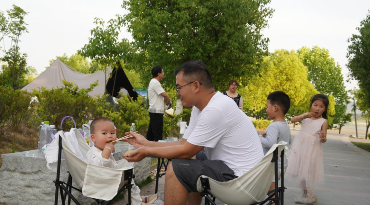 5月3日,郧阳区龙舟广场化身亲子户外休闲天堂,大片草坪上,色彩斑斓的帐篷依次排开,家庭游客围坐野餐,孩童追逐嬉戏,风筝在蓝天下摇曳。图/记者 张婧 摄