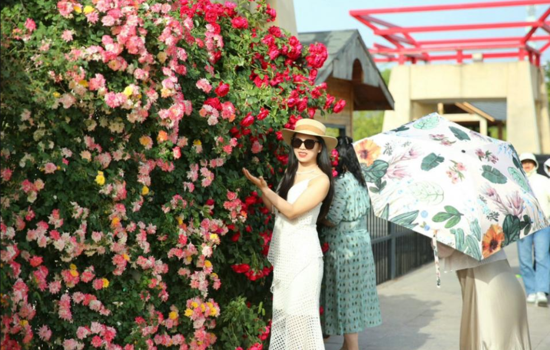 郧阳区天马大道月季花墙,游客纷至沓来,拍照打卡,享受假日好时光。图/记者 刘昆