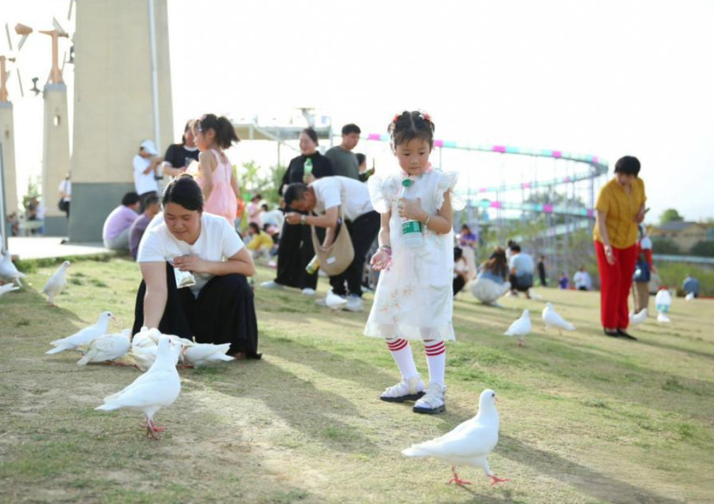 孩子们欢笑着喂食白鸽,构成一幅惬意的假日画卷。图/记者 吕世银