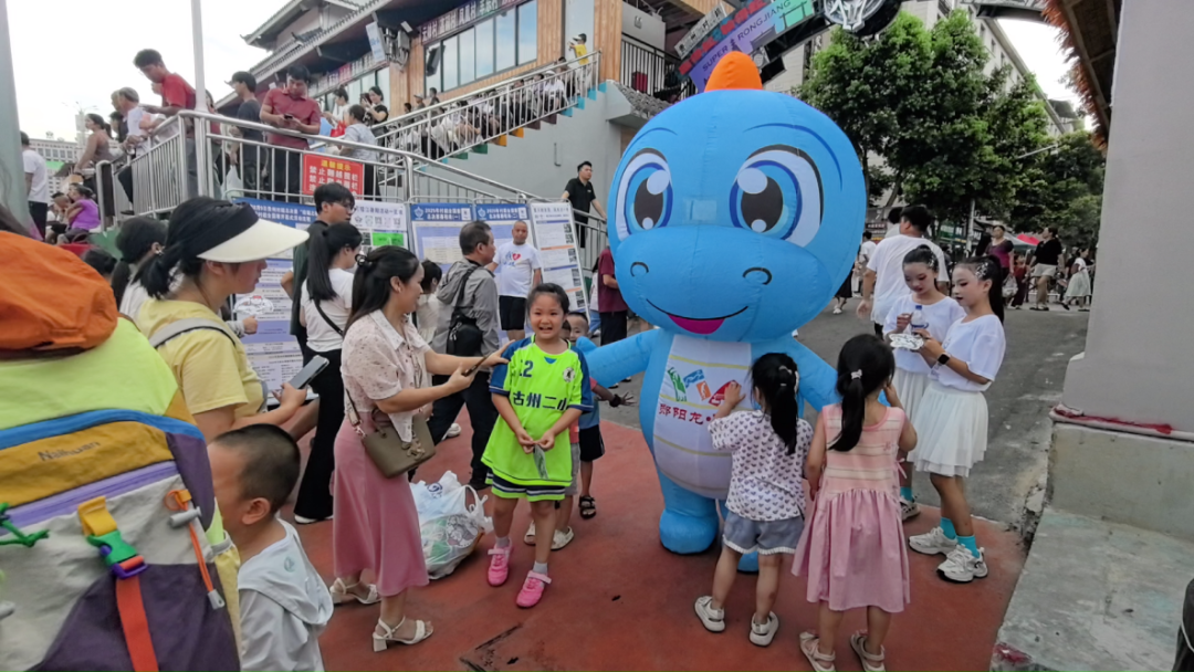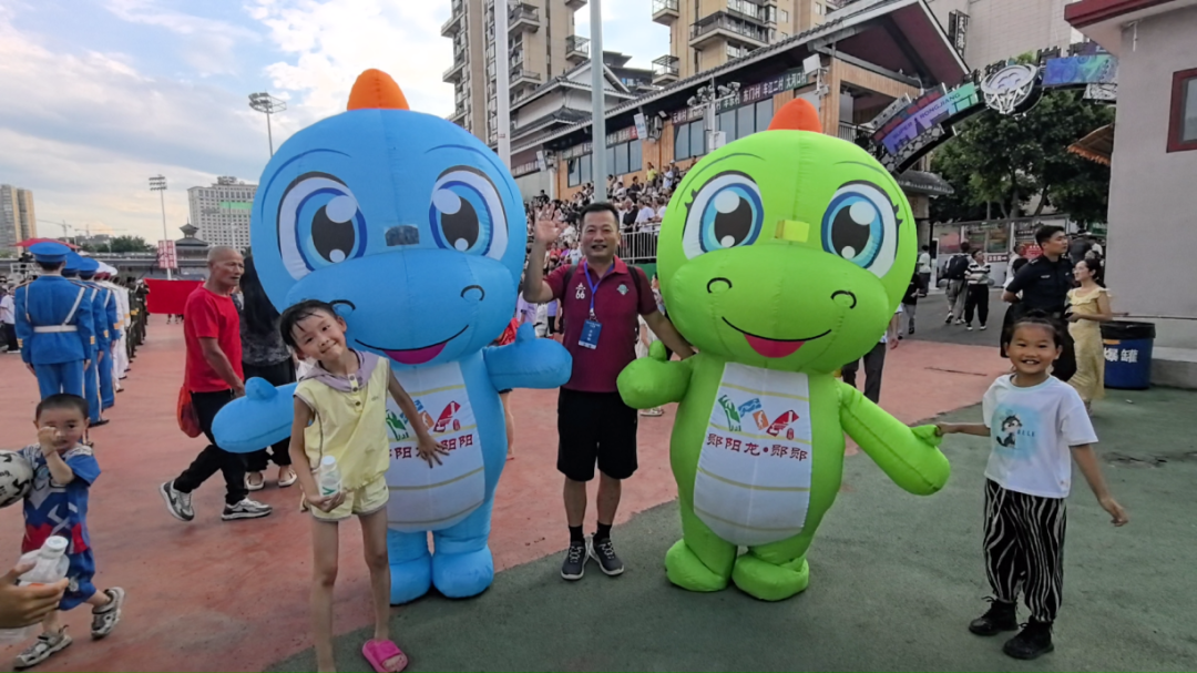全国赛开幕式现场人潮涌动、热闹非凡,郧阳的恐龙吉祥物惊喜亮相,憨态可掬的形象吸引了众多观众的目光。吉祥物不仅热情地与现场观众互动,还为大家发放了精心准备的小恐龙伴手礼,让观众感受到了来自郧阳的诚意和温暖。