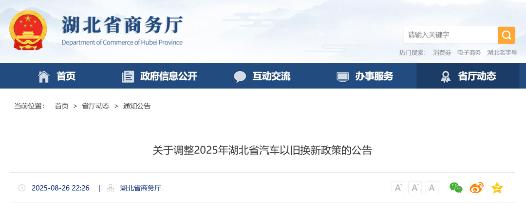 8月26日,湖北省商务厅发布《关于调整2025年湖北省汽车以旧换新政策的公告》。