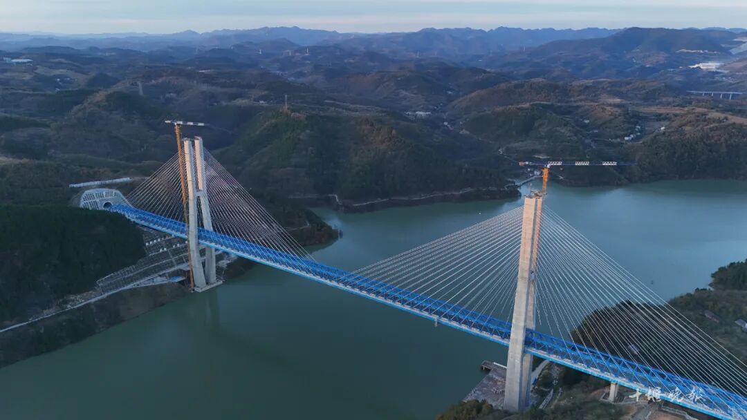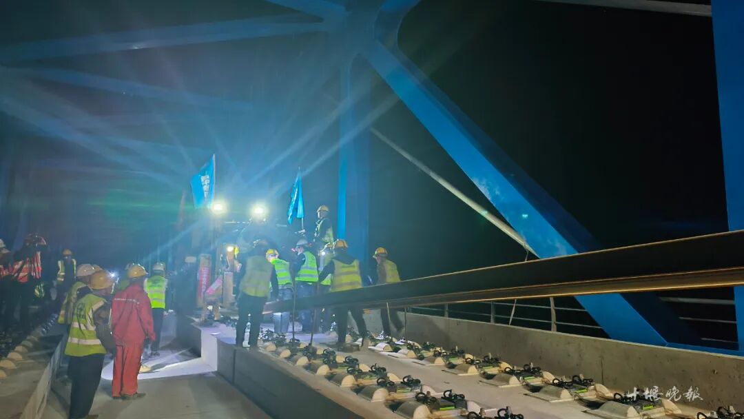 正在进行右线铺轨的汉江特大桥,由武九客专湖北公司建设管理、中铁十一局承建。该桥主跨420米,跨越丹江口水库库区,是世界最大跨度梁桁组合结构高铁斜拉桥。