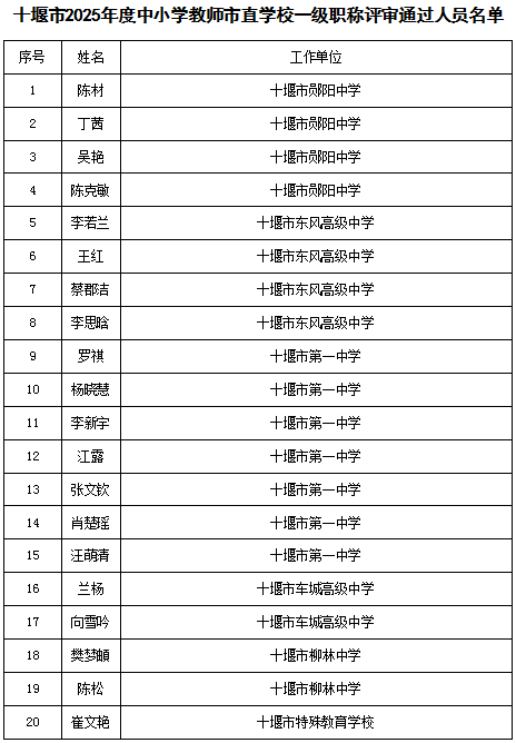 4.十堰市2025年度中小学教师市直学校一级职称评审通过人员名单(20人)