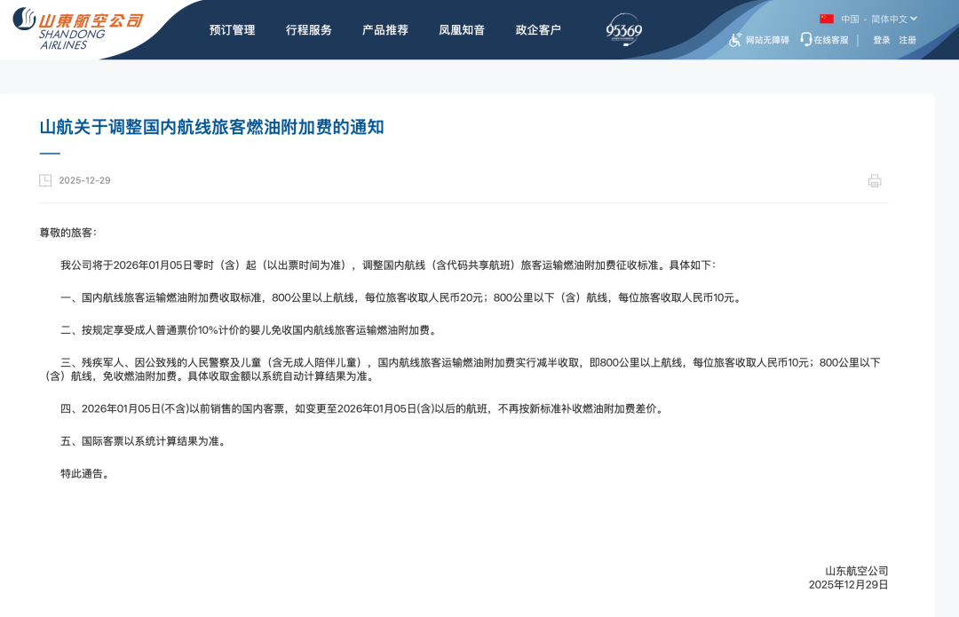 12月29日,山东航空下发通知,自2026年1月5日0时起,下调国内航线旅客运输燃油附加费征收标准。具体如下: