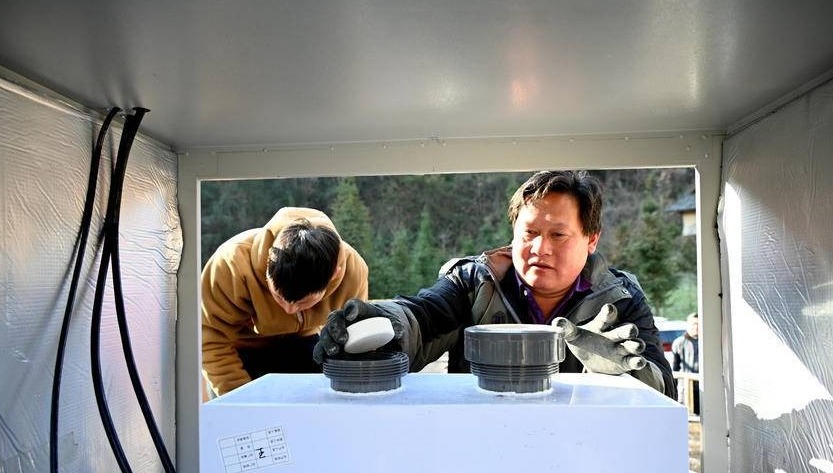 1月7日,施工技术人员在郧阳区五峰乡下三岔村水厂安装小型自动化加药消毒设备。