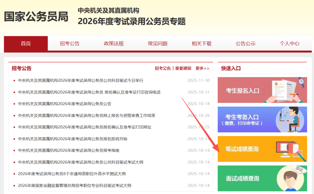 笔试成绩查询入口已开通,考生可登录国家公务员局中央机关及其直属机构2026年度考试录用公务员专题网站,查询笔试成绩和合格分数线,点击“笔试成绩查询”按钮,凭借身份证及准考证进行查询。