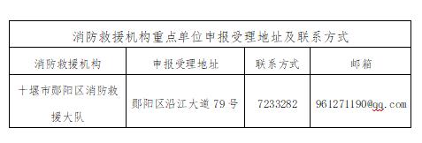 申报途径及方式:请拟申报单位如实填写《湖北省消防安全重点单位申报备案登记表》,并将纸质盖章件报送至郧阳区消防救援大队或将纸质盖章扫描件发送至郧阳区消防救援大队邮箱。联系单位地址如下: