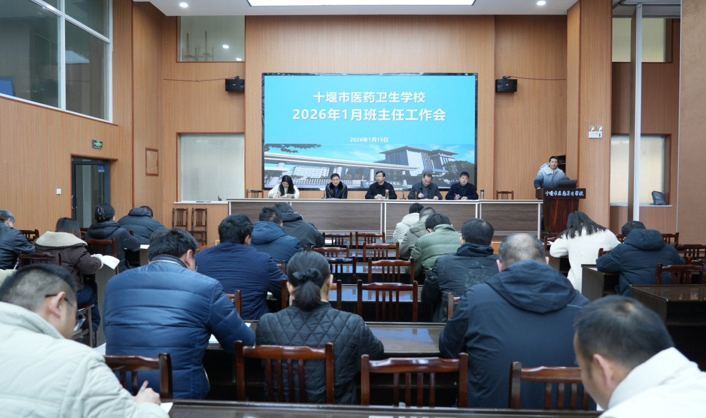 1月15日下午,十堰市医药卫生学校在实训楼一楼会议室召开2026年1月班主任工作部署会议,聚焦学期结束前的关键阶段,系统部署强化安全管理、严肃考风考纪等重点工作,确保本学期各项工作平稳、有序、圆满收官。学校主要领导、分管领导、学生科负责人及全体班主任(含实习班)参加会议。