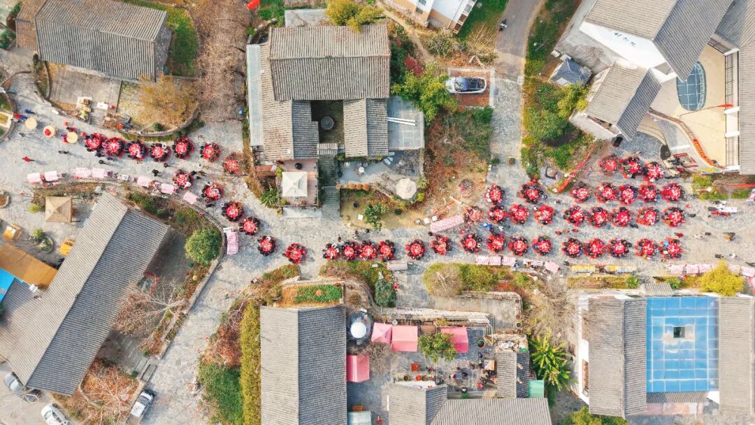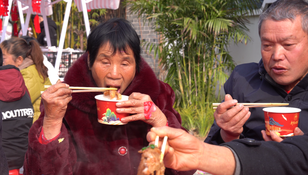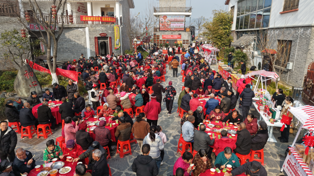 活动在精彩的凤凰灯舞表演中拉开序幕,现场还举行了“开年福杀年猪”传统仪式,包含祈福、请猪、贴福等环节,寄托对丰收的感念与对来年的美好祝愿。中午时分,在龙韵村村落文化记忆街,全村300多名60岁以上老人齐聚一堂,共同品尝美味菜肴,共享发展成果。活动现场还设有年货市集,游客顺手带上几份乡土特产返程,让“舌尖上的体验”延伸为“指尖上的消费”。