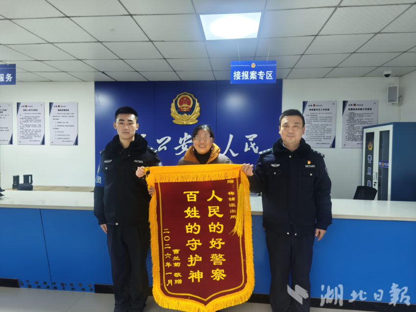 1月19日清晨,十堰市郧阳区梅铺镇居民曹某冒雨雪将一面印有“人民的好警察 百姓的守护神”的锦旗送到梅铺派出所民警手中,对梅铺派出所民警成功帮其追回误转的八万余元货款表达诚挚感谢。