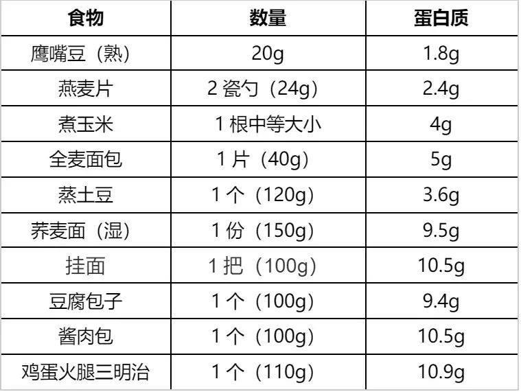 • 酱肉包:1个• 牛奶燕麦片:1碗,2勺即食燕麦片,倒入牛奶,微波炉内加热1分钟• 即食豆干:2小袋• 圣女果:6~8颗,补充维生素和膳食纤维蛋白质=1个酱肉包(10.5g)+1碗燕麦牛奶(9.9g)+1袋即食豆干(5.3g)+6~8 颗圣女果(1.3g)=27g