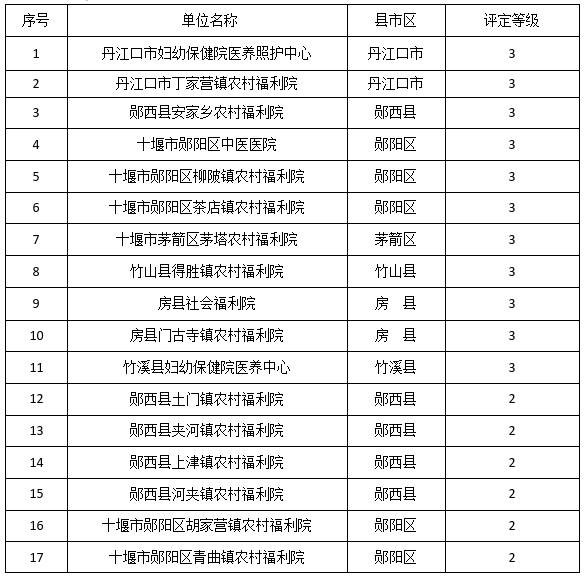2025年度十堰市养老机构一至三级等级评定工作于2025年12月启动开展。根据《湖北省养老机构等级评定管理办法》(鄂民政发〔2025〕18号)和《省民政厅关于开展2025年度养老机构等级评定工作的通知》有关规定,经养老机构自愿申报、民政局资格审查、评定专家组实地综合评价、市养老机构等级评定委员会审议等程序,现将通过评定的养老机构予以公示。