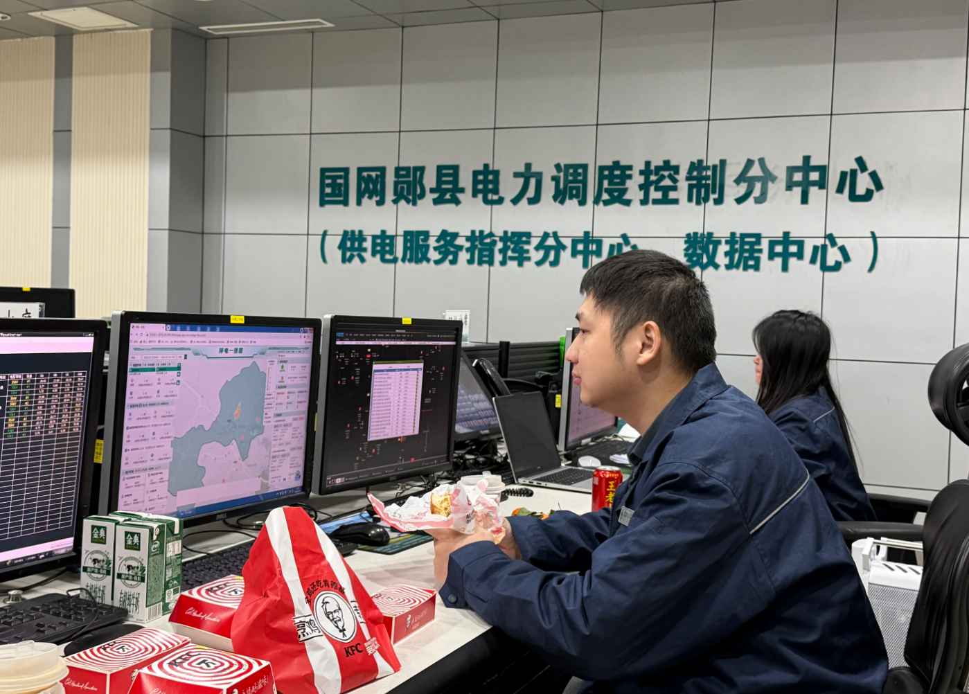 在郧县电力调度控制分中心,工作人员坚守岗位,以别样方式共迎新春。他们围坐工位,共享简餐,在忙碌间隙感受团圆氛围。屏幕上跳动的数据,映衬着他们专注的神情;桌前的餐食,传递着“以岗为家”的温情。他们用责任守护电网安全,以坚守诠释奉献担当,为千家万户的光明与温暖默默付出,让这个春节更有意义。