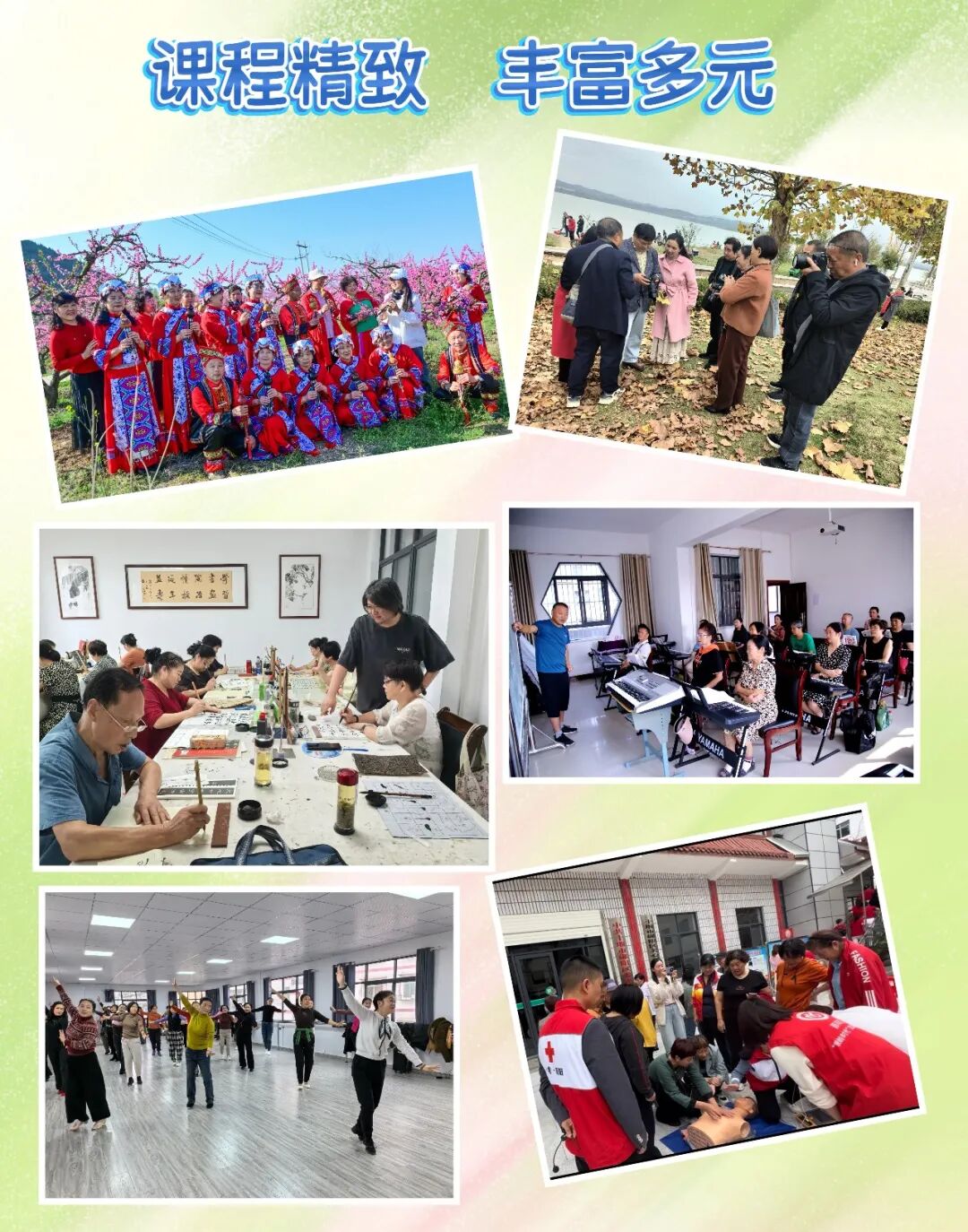 5.书法班、国画班、电子琴班、萨克斯班、非洲鼓班、老年瑜伽班由学校提供学习器材,其它专业学习教材、相关用品根据老师安排自备。