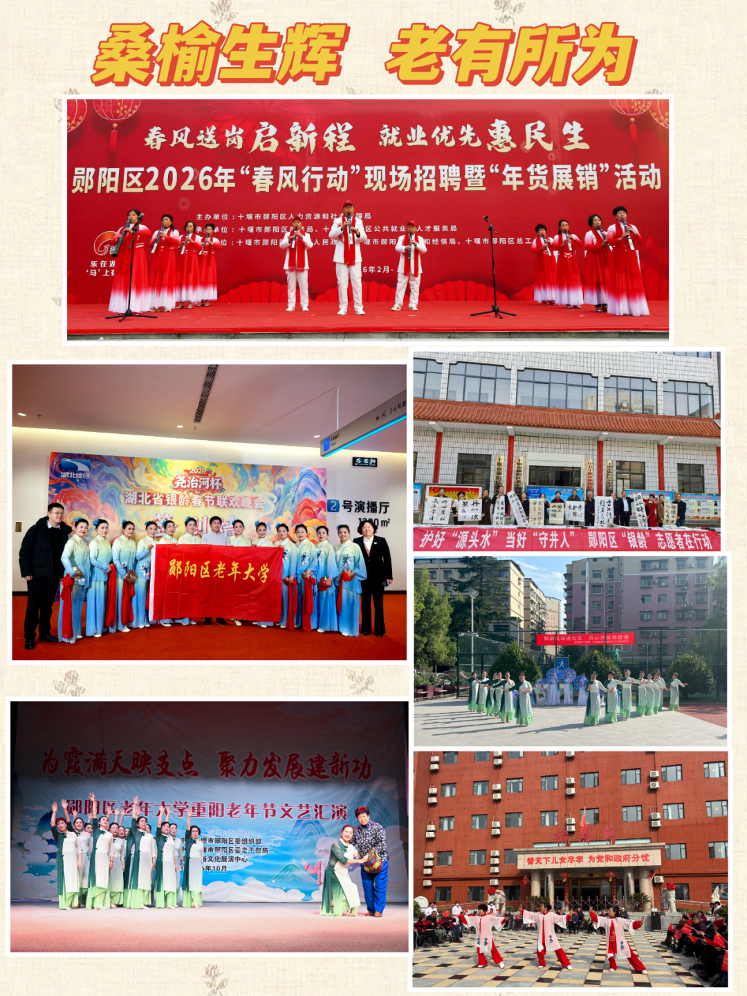 郧阳区老年大学位于城关镇文化广场西侧,文化西巷11号,区委老干部局院内,交通便利、环境优美。学校开设有书法、合唱、武术、舞蹈、葫芦丝、走秀、电子琴、柔力(乐)球、萨克斯、国画、摄影、老年瑜伽等专业教学班。师资优良,教学效果好,深受学员好评。2026年春季学期将新开设非洲鼓、体育国标舞2门课程。开学在即,欢迎新老学员报名学习。