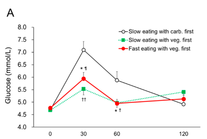 2023 年发表在《营养素》上的一项研究显示,摄入同样的食物,先吃蔬菜再吃主食,能改善餐后血糖和胰岛素水平[7]。
